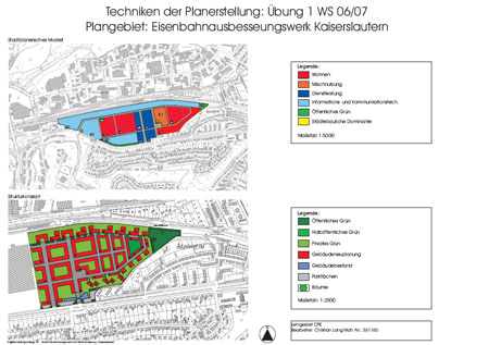 Bei dieser Übung war das Thema, das Eisenbahnausbesserungswerk in Kaiserslautern als Statdplanerisches Modell im Maßstab 1: 5000 und als Strukturkonzept im Maßstab 1:2500