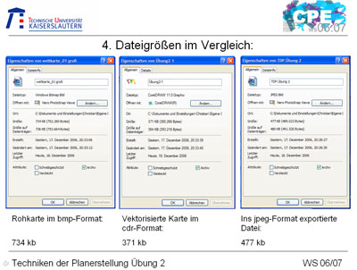 Die Ergebnisse dieser Übung bezogen sich zum einen auf die Editierbarkeit, die bei Rasterformaten sehr eingeschränkt ist,bei Vektorformaten aber sehr gut vorhanden ist, da man einzelne Objekte einzeln aufgreifen und bearbeiten kann.