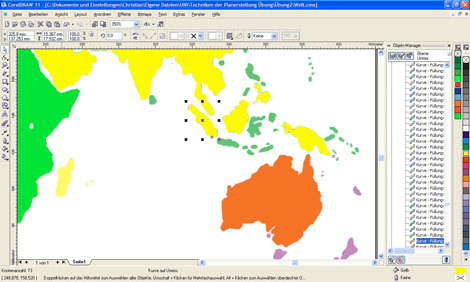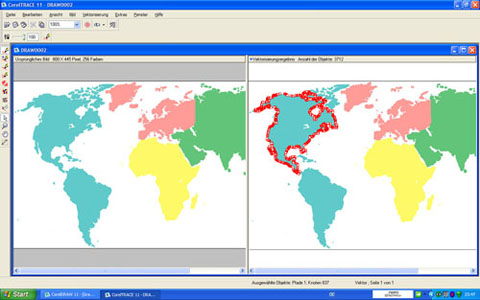 Als erstes wurde die Originalkarte mit dem in Corel Draw 11 enthaltenen Programm Corel Trace vektorisiert,das heißt von dem Programm aus Linien, Kurven, Flächen und Punkten neu zusammengesetzt.