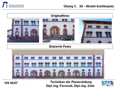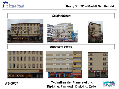 Als ersten Schritt galt es sich einen Überblick über den Platz zu verschaffen und Bilder zu machen. Die Bilder der Gebäude mussten dann mit Photoshop entzerrt werden, um Texturen für die Fassaden zu gewinnen.
